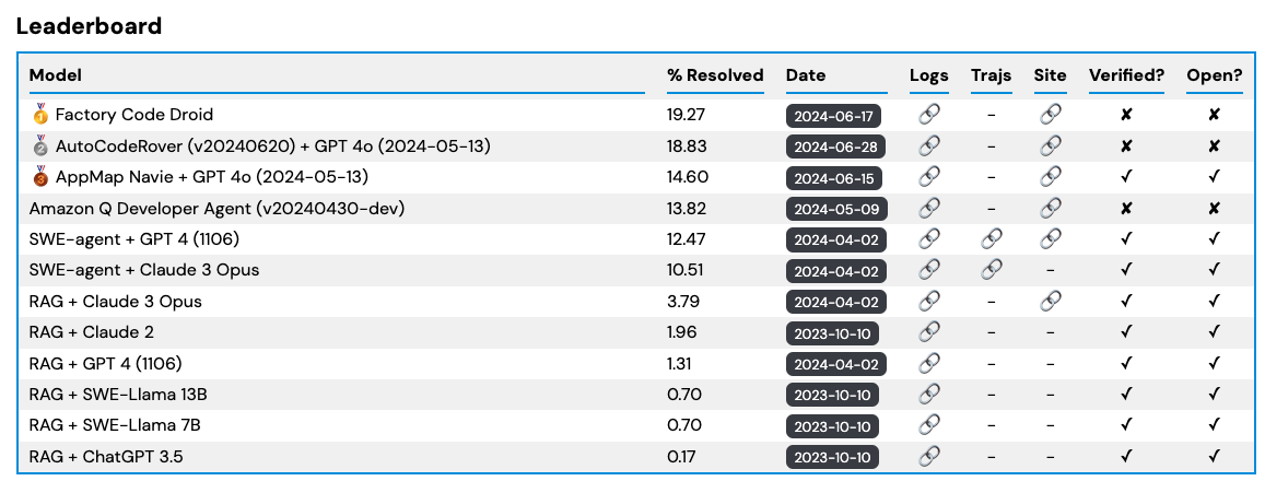 The SWE-bench benchmark evaluates coding agents using real GitHub pull requests that include corresponding tests from popular projects (numpy, flask, etc.). The leaderboard shows the current state: the best open-source agent (SWE-agent) has a 14.6% success rate, despite significant engineering efforts to simplify command structures, enhance environment feedback, and implement guardrails. Impressive results, but still a lot of room for improvement.