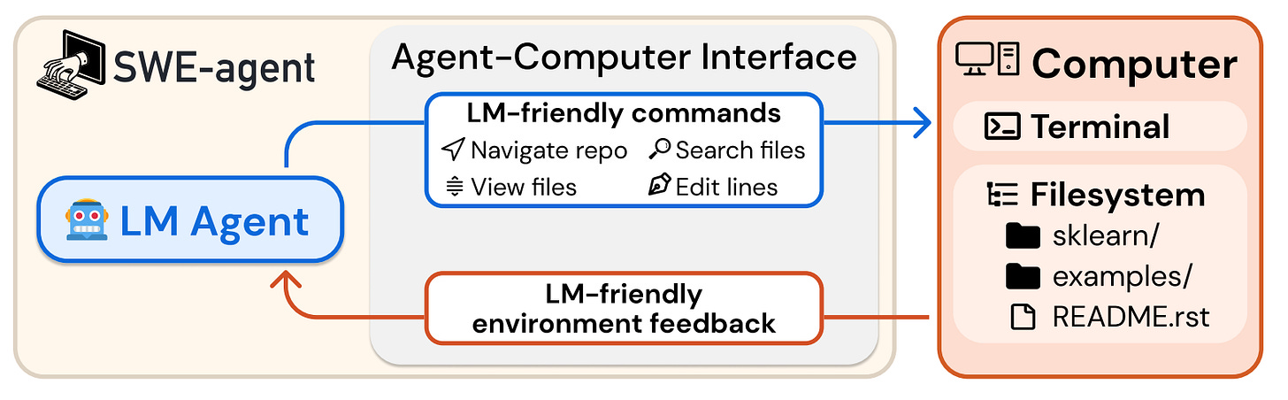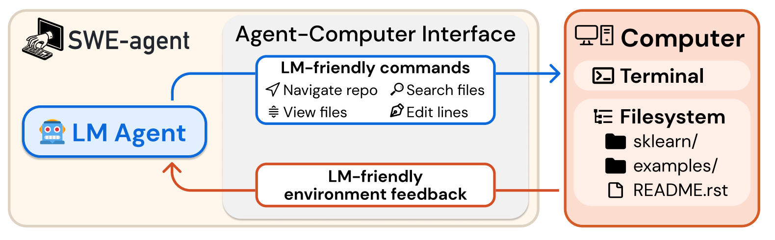 SWE-agent is a leading code-writing AI agent designed to autonomously fix bugs and address issues in real GitHub repositories. It interacts with a Docker container leveraging a cloned project and its dependencies. Interaction with the environment is done using engineered APIs (Tools) known as the Agent-Computer Interface. These APIs were shown to significantly enhance the agent's ability to navigate repositories, edit code, and execute tests.